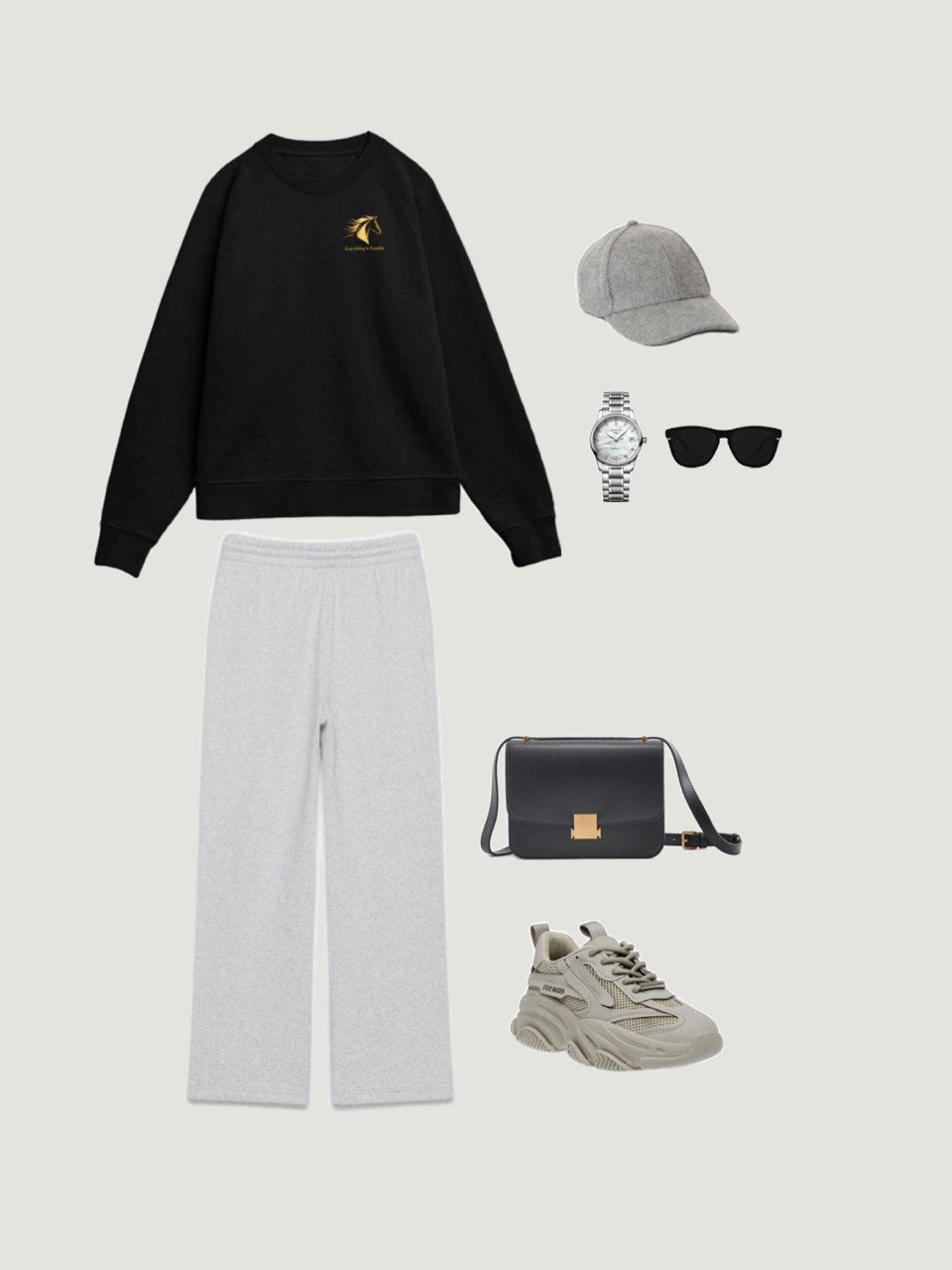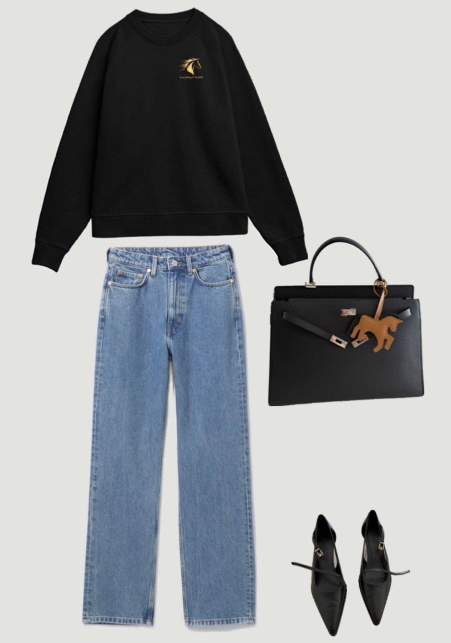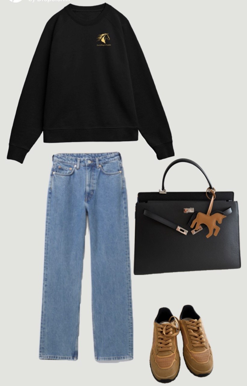 You can throw on your favorite jeans and choose sneakers in a color that complements the embroidered horse on the sweatshirt. Add a black bag to the look or take it up a notch by clipping a bag charm to your black bag in a color that matches the embroidery. In this example, we finished the outfit with a black bag and a horse charm that ties in with the sneakers.