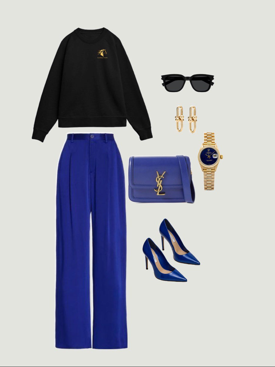 The combination of blue and black makes the look feel luxurious. Try pairing the sweatshirt with blue pants, matching shoes, and a bag.