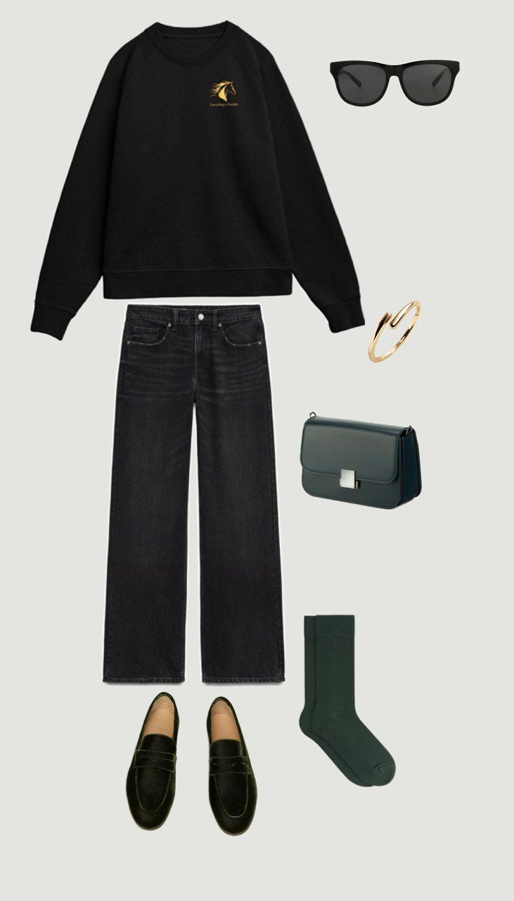 You can style the sweatshirt with black jeans, dark green socks, and loafers, then carry a bag in the same color. Add a gold-toned bracelet and black sunglasses. It’ll look chic and interesting.